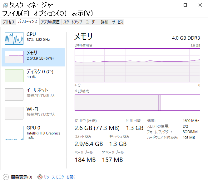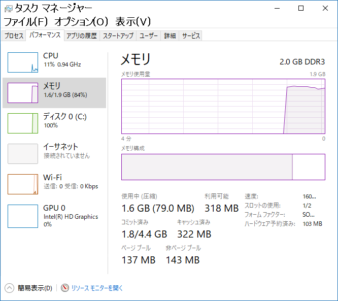 今までRAM 容量不足の問題に取り組んできて、RAM が不足していると判定する条件が分かった。それは、「RAM 使用率が80%以上で、且つ補助記憶装置が使用率が100%」というものだ。