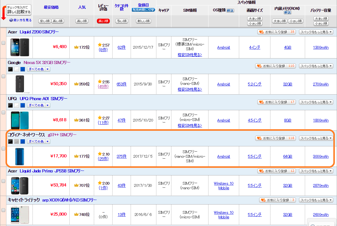 今まで使っていた物が「g07++」なのだが、恐ろしいことにこの製品は価格コムに於けるSIM freeスマホの中で最低の評価だった。本製品より下位にAcer の製品が一つあるが、評価者が一人なので信頼性が不十分なので、実質的に「g07++」がドンケツだ。