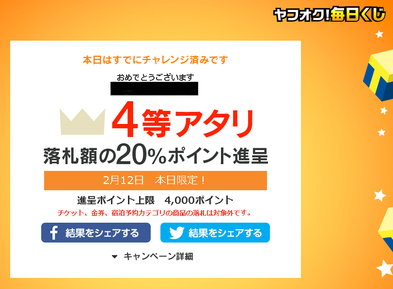 、私はヤフオクの「ヤフオク!毎日くじ」で4等を当てた。この効果は「落札額の20%ポイント進呈」。